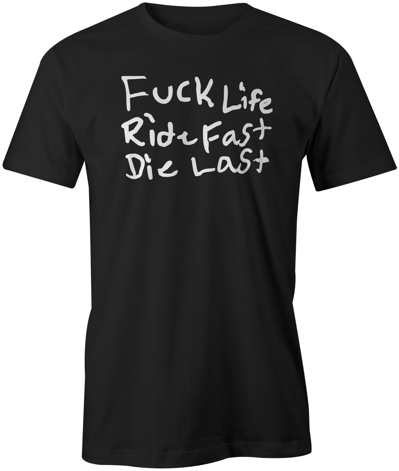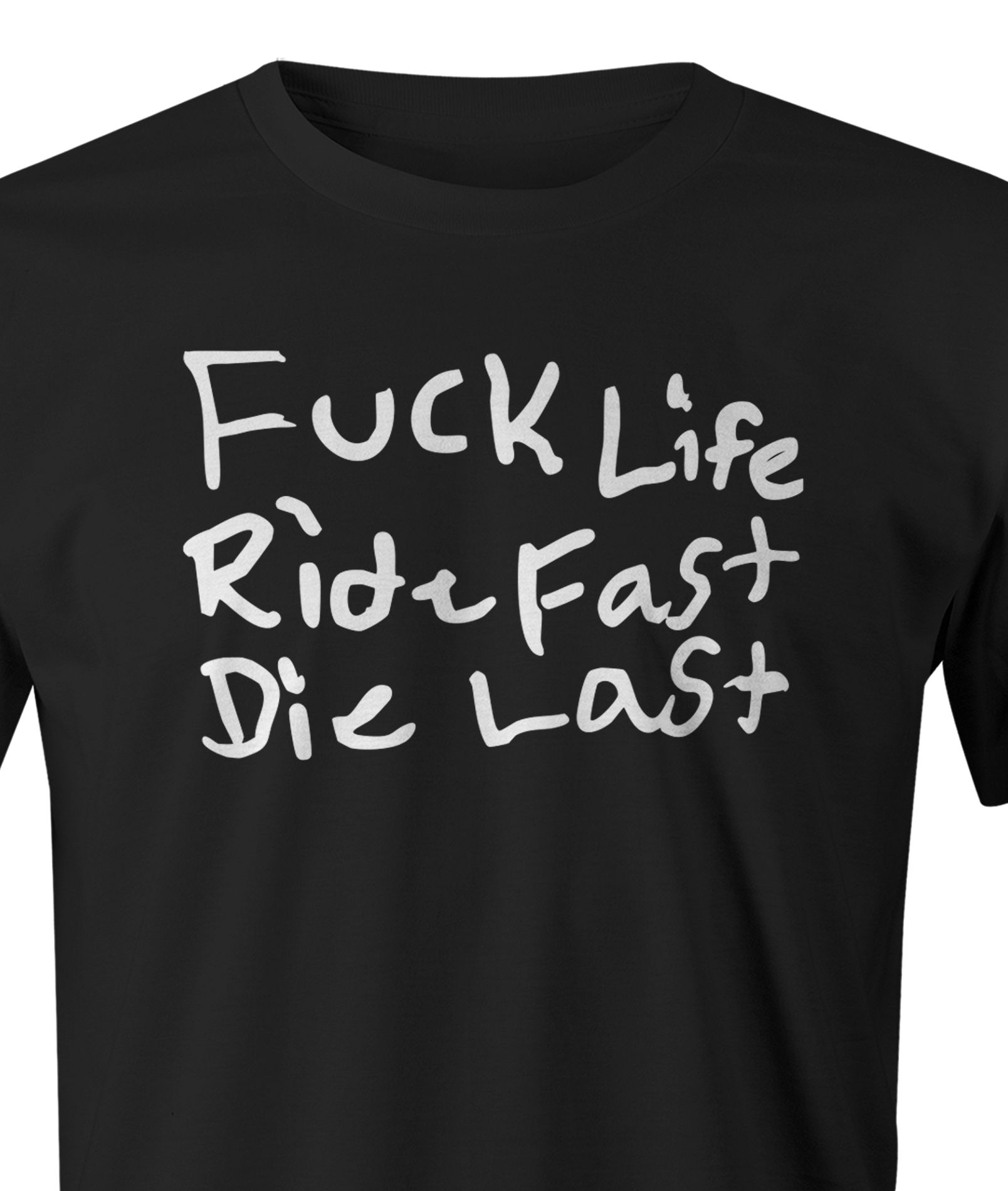 Featuring their bold catch phrase "Fuck Life, Ride Fast, Die Last" in their own handwriting.